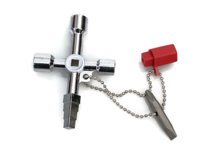 Uniwersalny klucz wyposażony w końcówki do otwierania i zamykania większości popularnych systemów skrzynek oraz szaf sterowniczych.