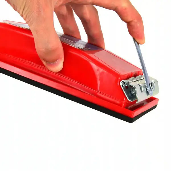 Materiał ścierny mocowany jest przy pomocy dwóch zacisków sprężynowych. Takie wykonanie sprawia, że pozostanie na swoim miejscu, nawet w przypadku silnego tarcia.