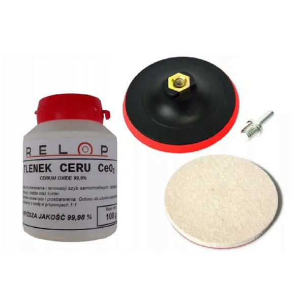 ZESTAW DO POLEROWANIA SZKŁA TLENEK CERU CeO2 + FILC + DYSK Z RZEPEM + TRZPIEŃ